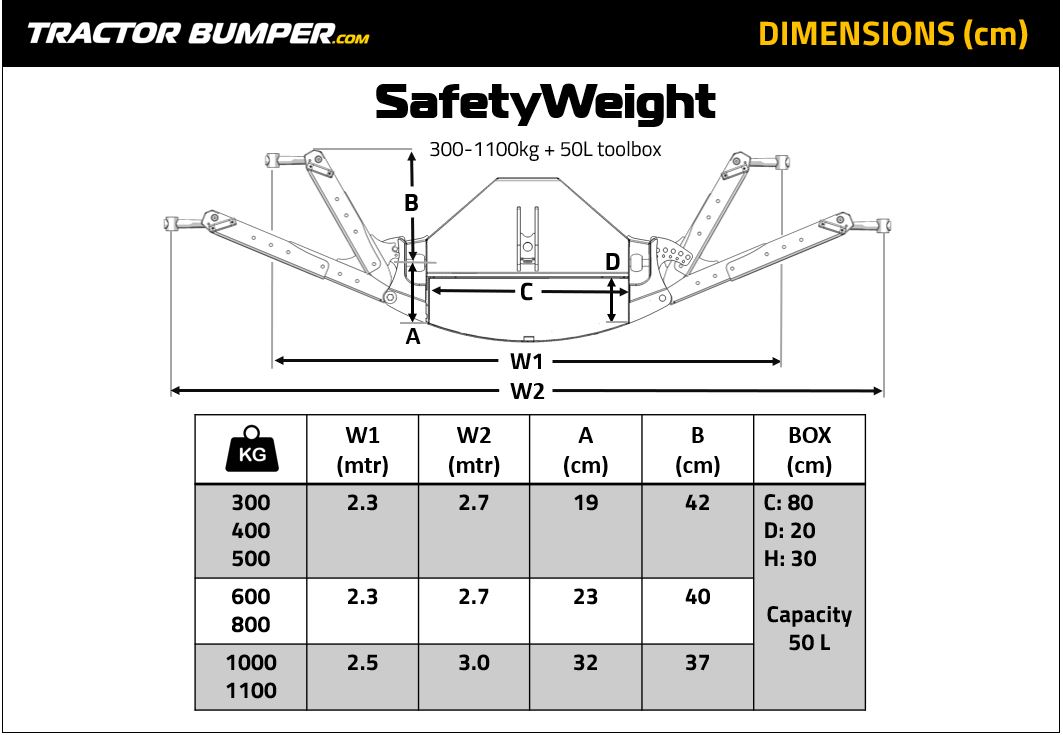 Side panels are fully adjustable, enabling you to vary the bumper width between 2.3 and 2.7m. Tested extensively and proven in the field, SafetyWeights also have a towing point in the top link support where a rope can be attached.
